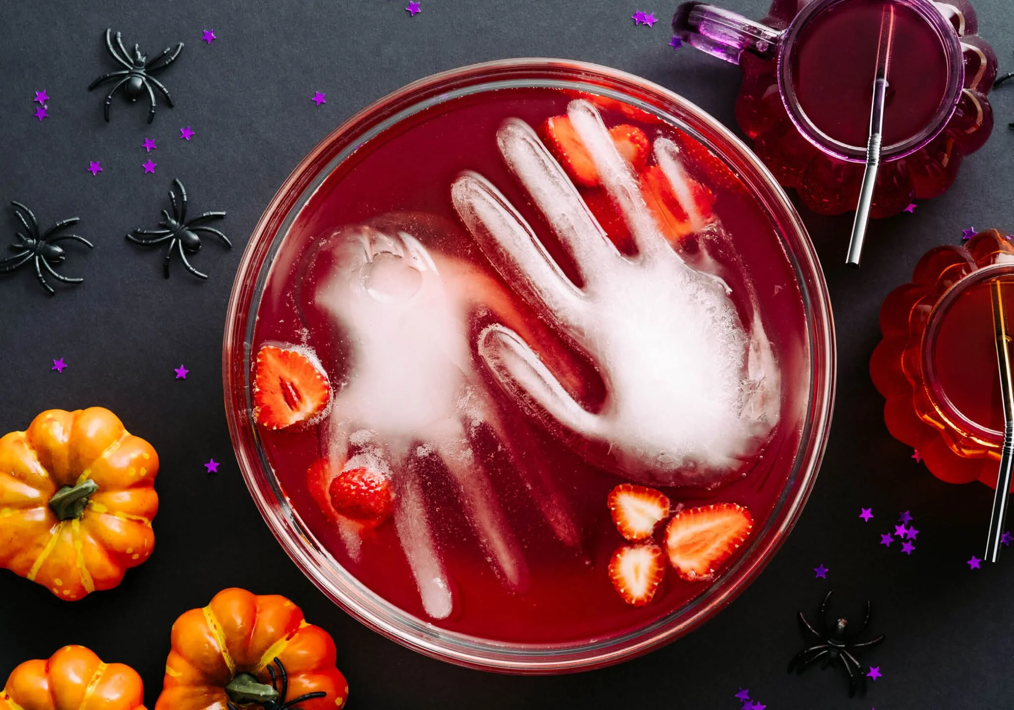 Fill two or three clean, sterile gloves with water, tie them up, and place them in the freezer. Leave them in until they are solid ice. Right before your guests arrive, fill your punch bowl with a delicious drink and a little bit of ice, so the liquid cools down. Take your ice hands out of the freezer, remove the glove and place your frozen creepy hands in the punch bowl for spooky ice.