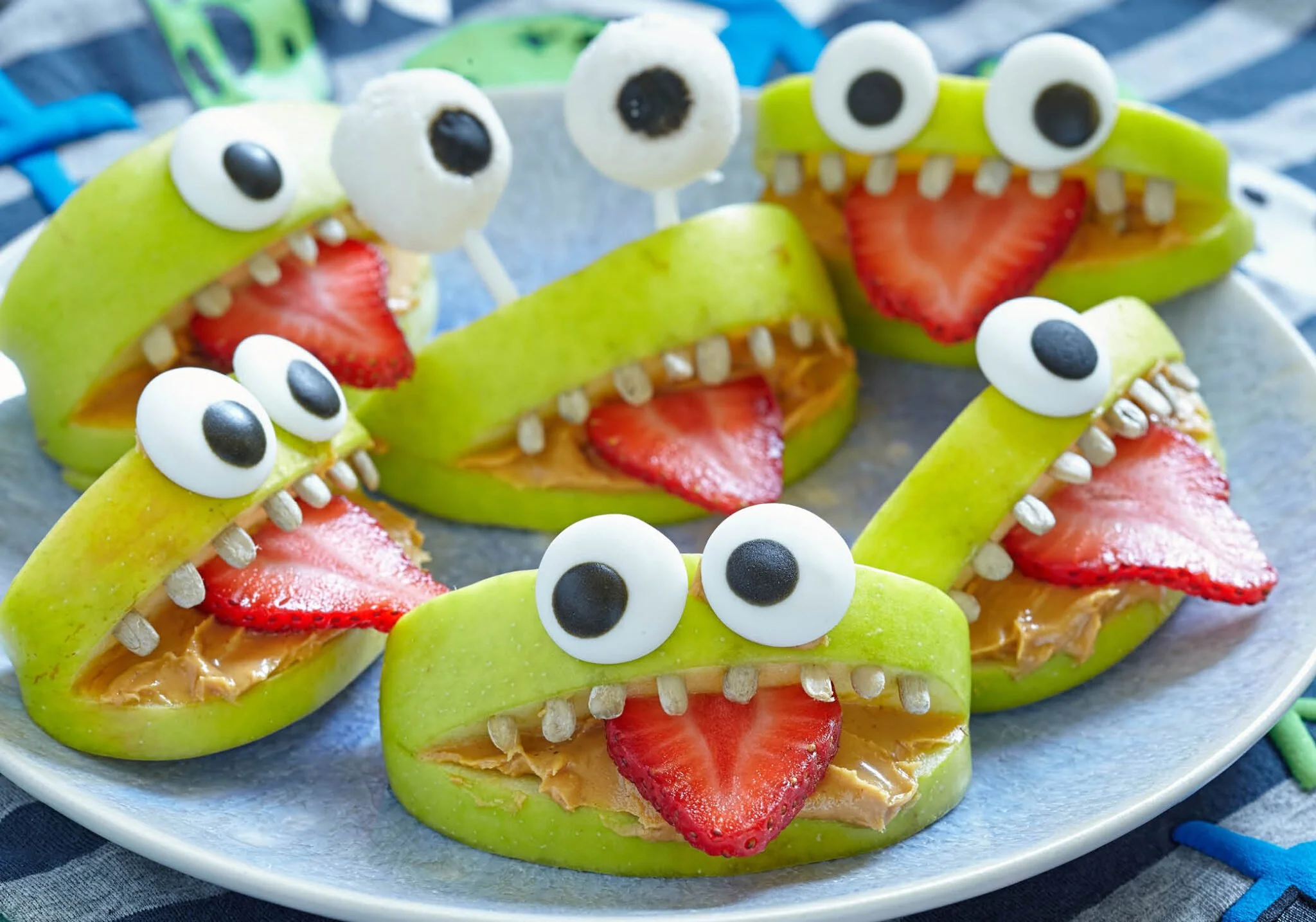 Spooky and healthy is always an option. All you need are green apples, strawberries, peanut butter, and sunflower seeds. First, cut the apple into slices. Take each slice and cut out a sliver in the middle that will serve as the mouth. Shmear peanut butter into the sliver (the mouth) and place a thin slice of a strawberry sticking out of the bottom to look like a tongue. Use sunflower seeds to make rows of teeth and top it off with two candy eyes.