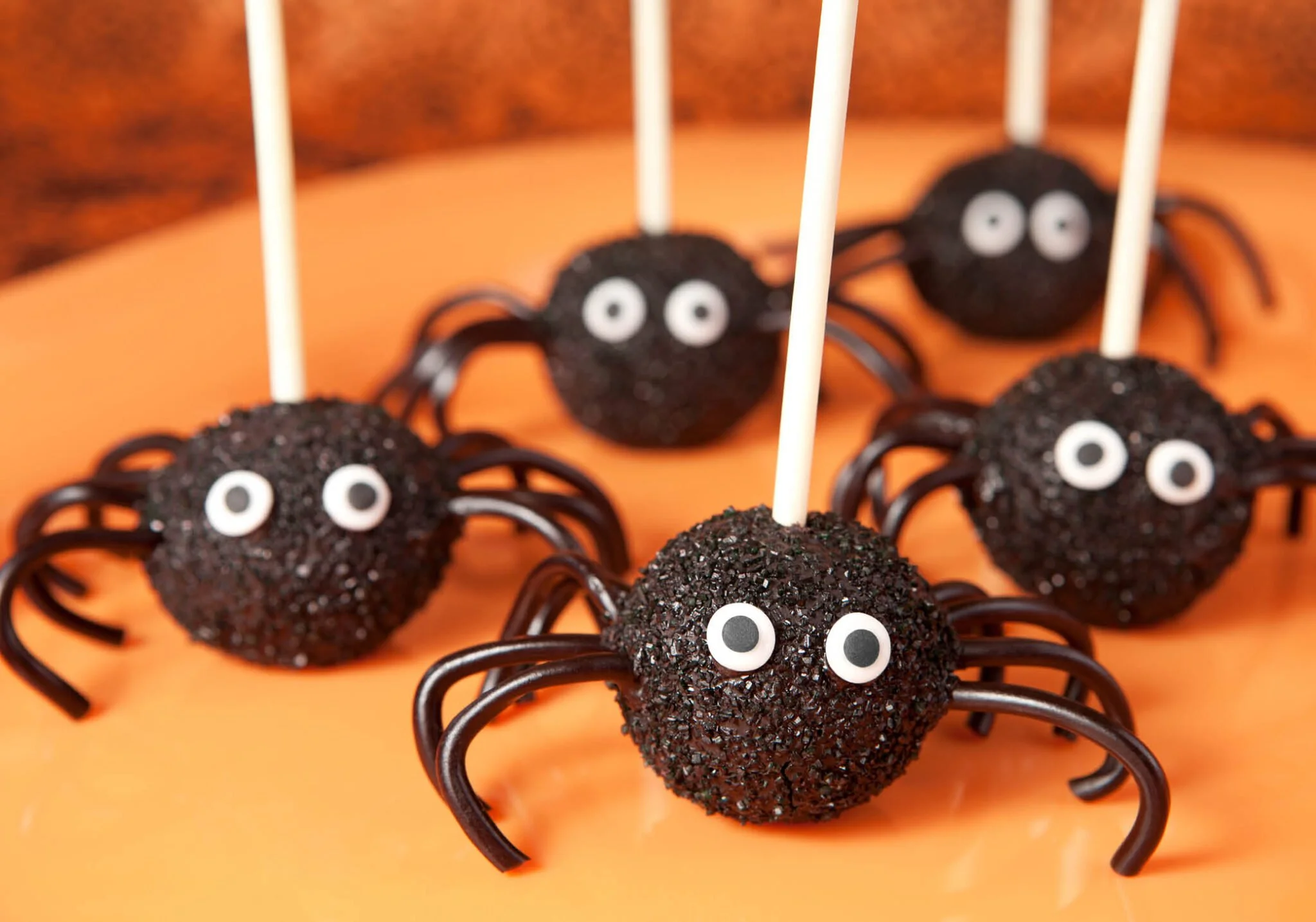Eight-legged cake pops anyone? First, make a batch of cake pops and cover the outside in fine chocolate sprinkles. Then, stick eight legs out the side and top it off with two candy eyes. Creepy, crawly, delicious.